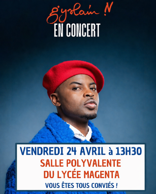 Par GUILLAUME LEBOURGEOIS, publié le mercredi 22 avril 2026 21:43 - Mis à jour le jeudi 23 avril 2026 10:27L'artiste Gyslain.N, lauréat du prix littéraire des lycéens et apprentis de la région Auvergne Rhône Alpes pour son roman Peau rouge sera en concert dans la salle polyvalente du lycée Magenta ce vendredi 24 avril à 13h30. Venez avec vos classes ! -