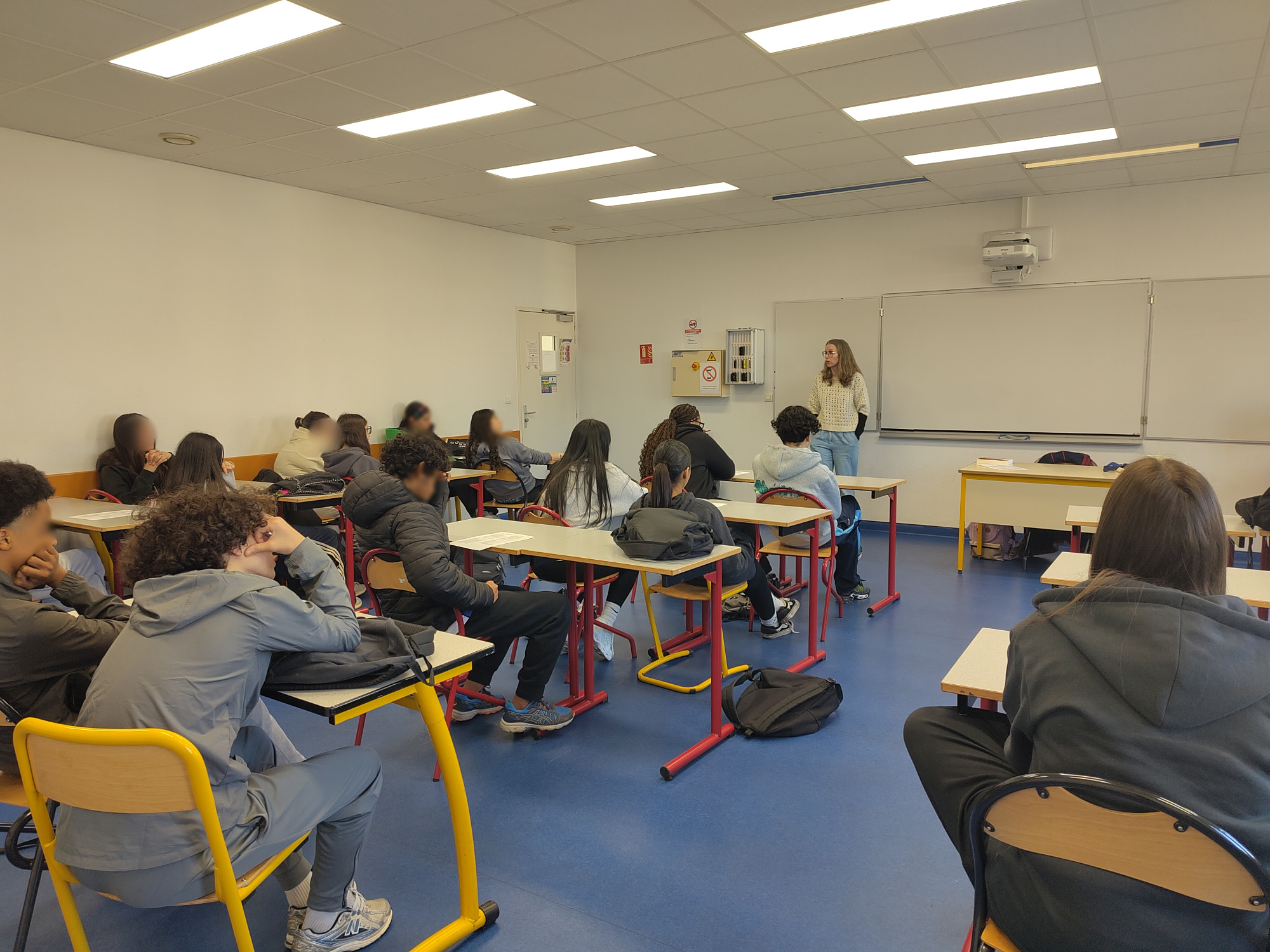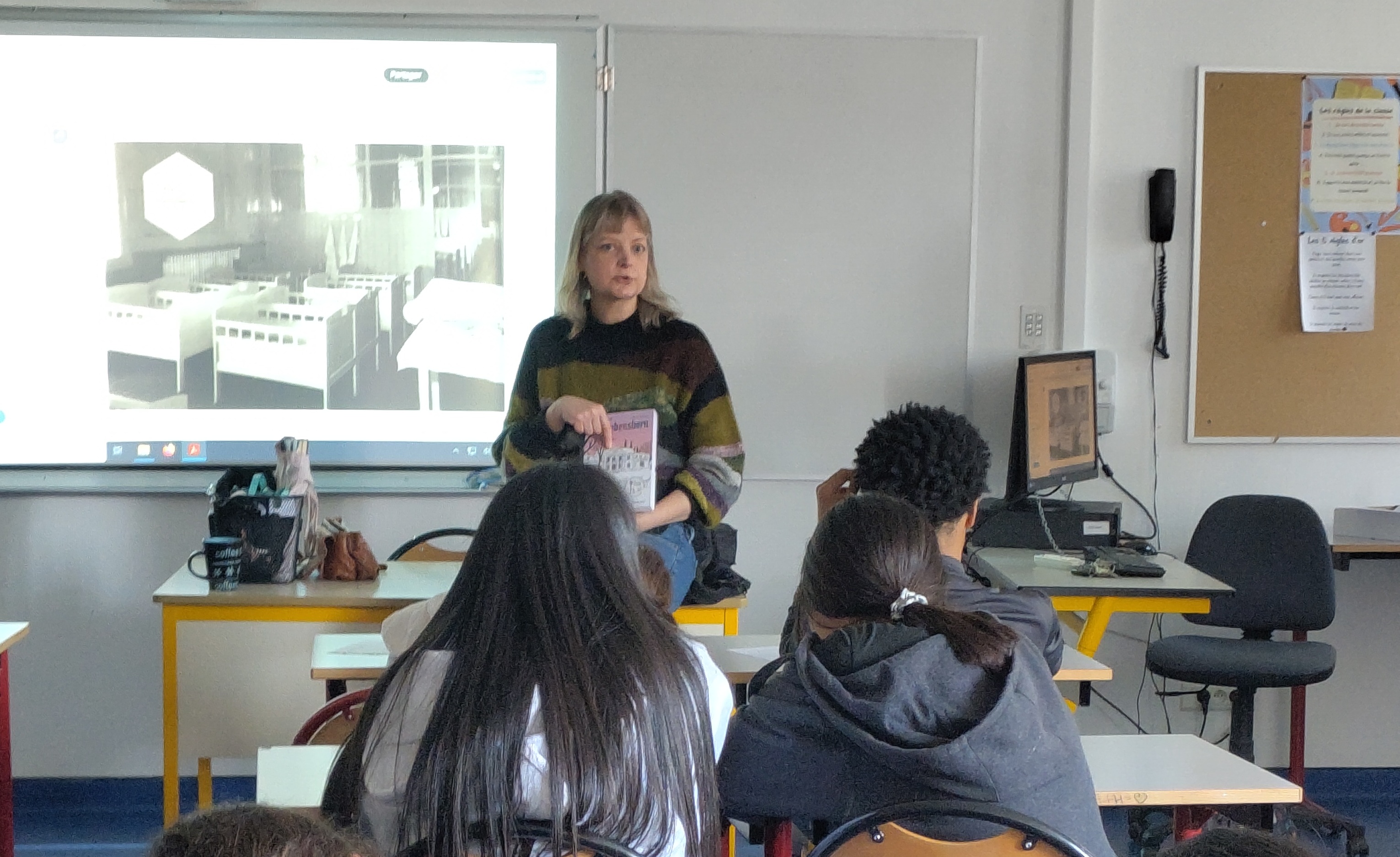 Après s'être eux-mêmes essayés à l'écriture de journaux intimes, réels ou fictifs, mêlant histoire personnelle et Histoire, nos élèves ont préparé la rencontre avec l'autrice du livre, au lycée. Isabelle Maroger est revenue sur toute la genèse du livre, et a embarqué les élèves dans le récit de sa quête des origines. Ils ont pu ensuite lui poser des questions sur son oeuvre, ses projets, ses habitudes de travail, ou sa vie d'autrice illustratrice. Ils lui ont lu quelques-uns de leurs textes et ont expérimenté avec elle le dessin des émotions d'un personnage. Pour l'occasion, les deux groupes de la classe s'étaient réunis et ont fait preuve ensemble d'une belle attention et motivation !