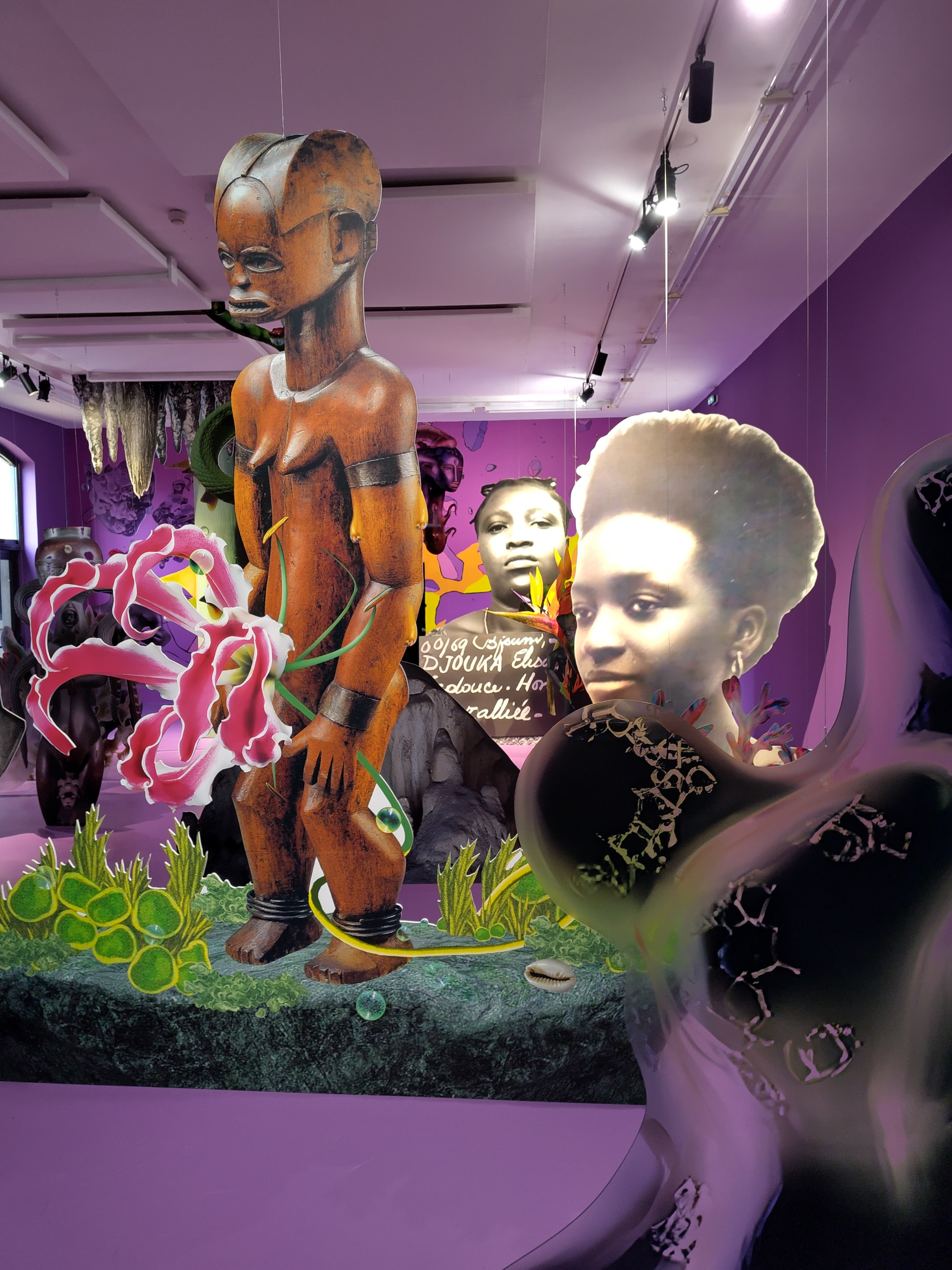"On entre dans une grande salle entièrement violette. Les oeuvres sont suspendues au plafond ou posées sur le sol. Le visiteur a l'impression de pénétrer dans une forêt et il se promène au milieu des oeuvres. Parmi elles, trois femmes apparaissent. Ce sont des femmes qui se sont battues pour l'indépendance de leur pays, pour sortir de la misère et sauver les générations à venir. " (Emmanuel)