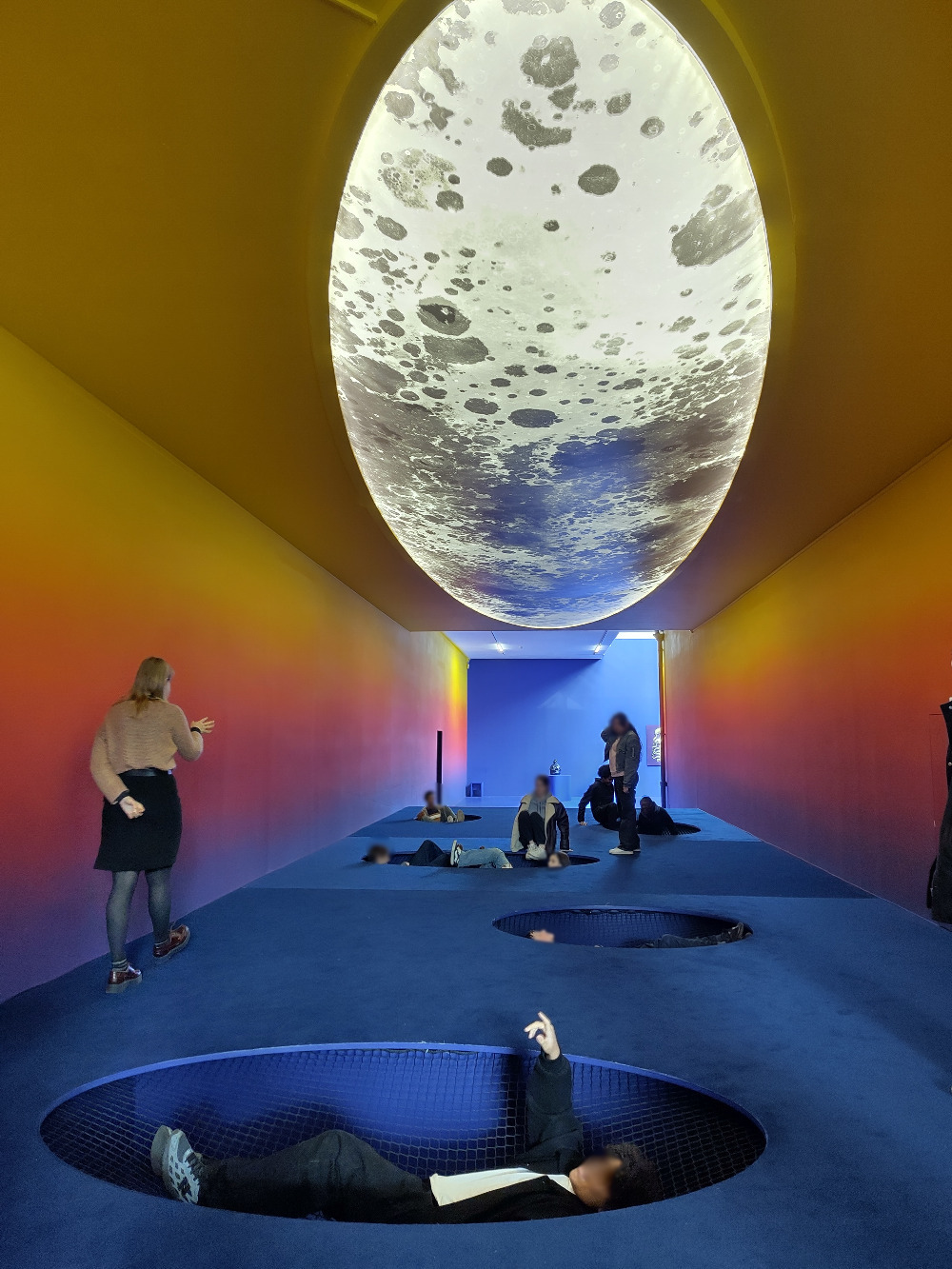 "Dans cette salle (image ci-dessous) , on était en immersion. On était allongés dans des hamacs. pendant qu'on était allongé, on avait une vue sur une lune d'une forme particulière (très ovale) et nous étions entourés d'un coucher de soleil peint sur tous les murs. Il y avait aussi une bande sonore avec des musiques et des voix. Il y avait par exemple une célèbre chanteuse américaine Whitney Houston ou Tupac Amaru Shakur et plein d'autres encore." (Juniper)